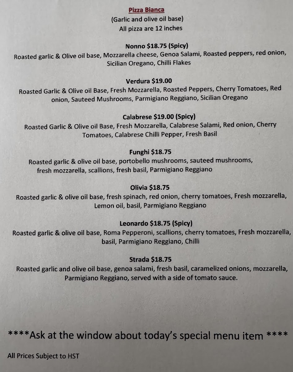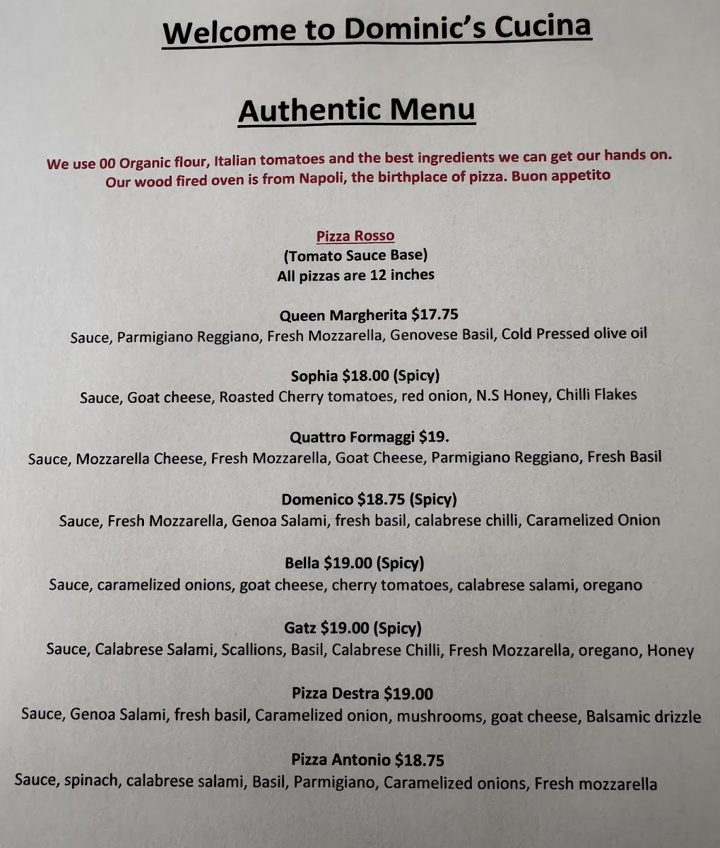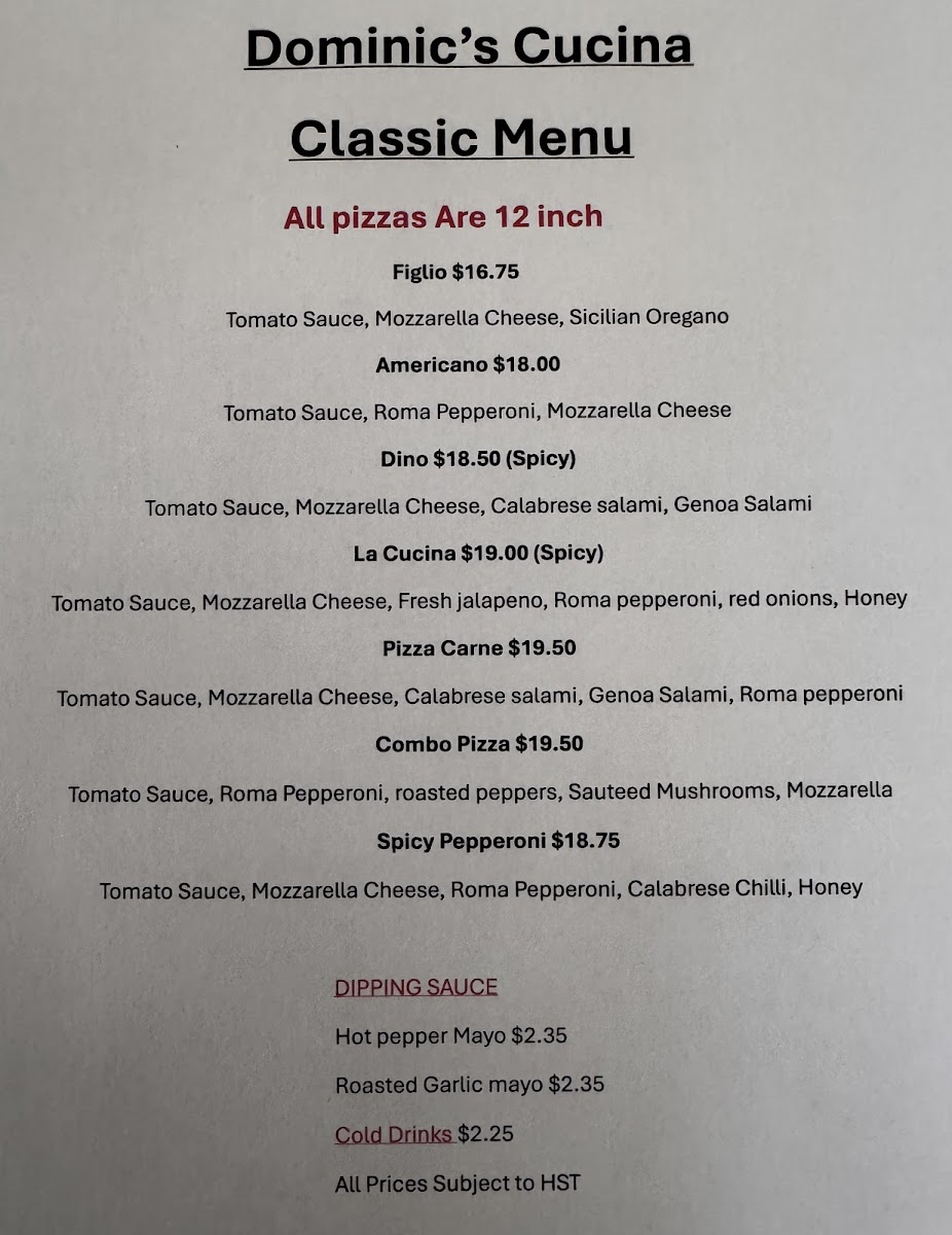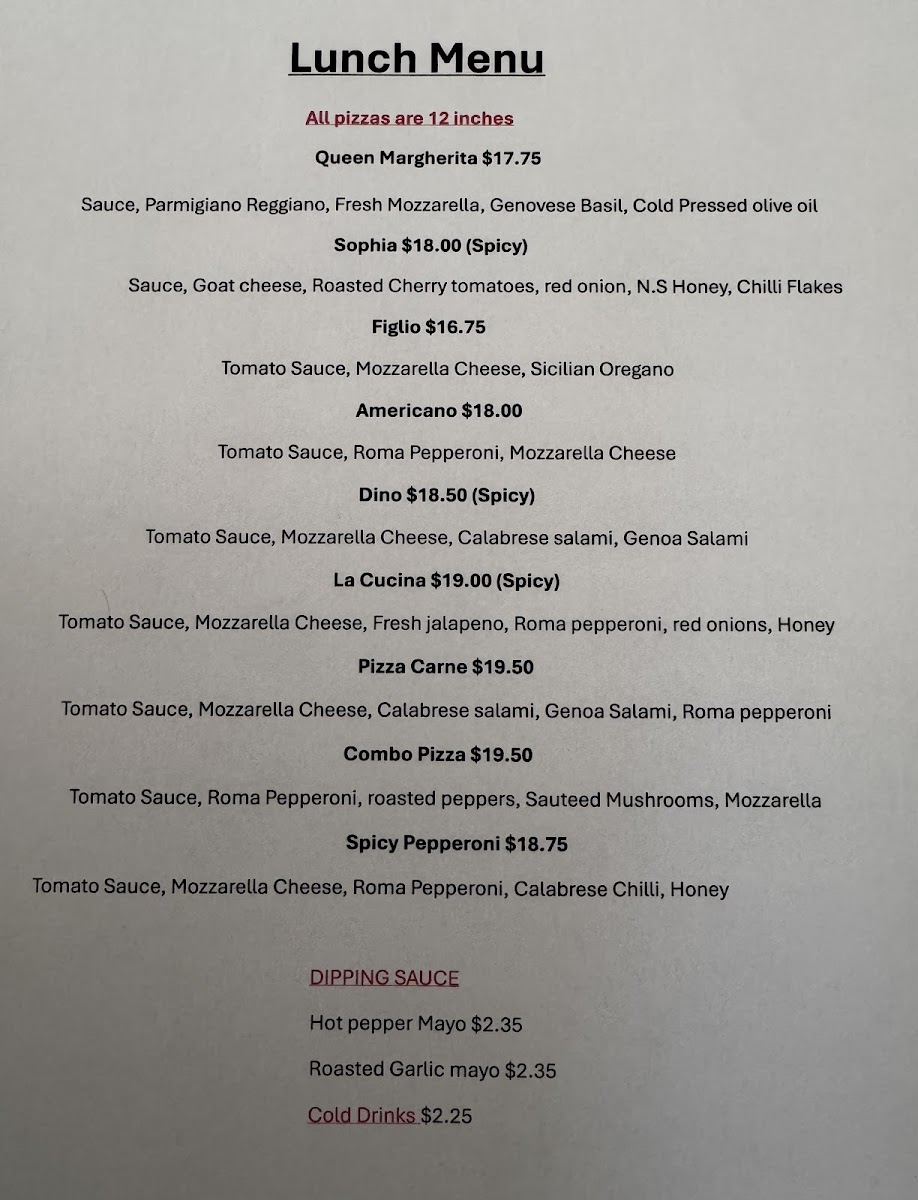 Dominic's Cucina offers a diverse and delicious lunch menu with a variety of unique options. The Queen Margherita stands out with its classic yet flavorful combination, while the Sophia and FiglioAmericano provide rich, comforting choices. For those looking for a hearty bite, the Dino offers a robust option. If you're in the mood for a little extra flavor, their Hot Pepper Mayo and Roasted Garlic Mayo dipping sauces are perfect accompaniments. The Nonno and Verdura dishes bring a fresh and vibrant taste, while the CalabreseFunghi and Olivia offer an exciting mix of savory ingredients. With cold drinks available to complement your meal, Dominic's Cucina delivers a satisfying and well-rounded menu for lunch.